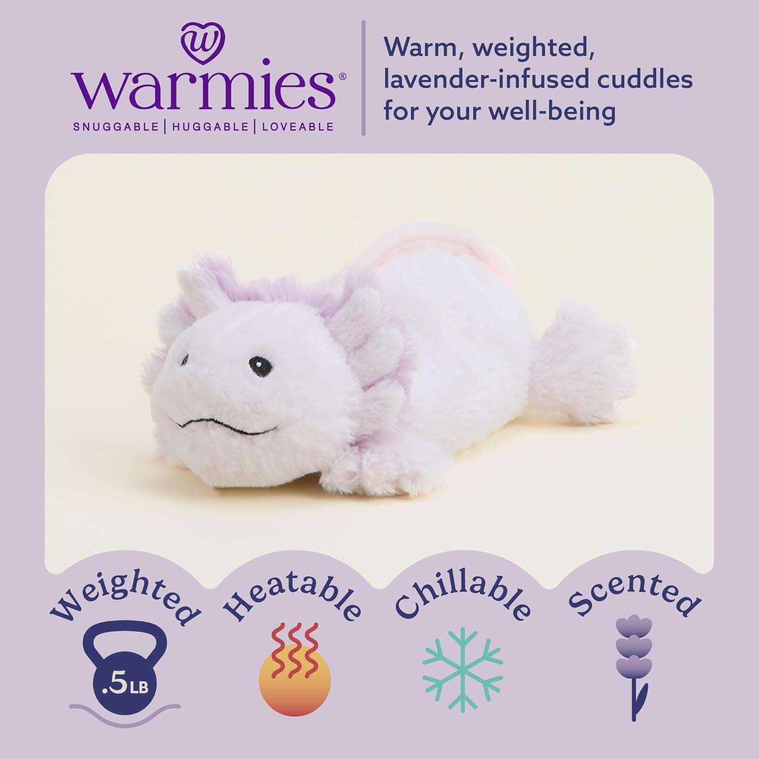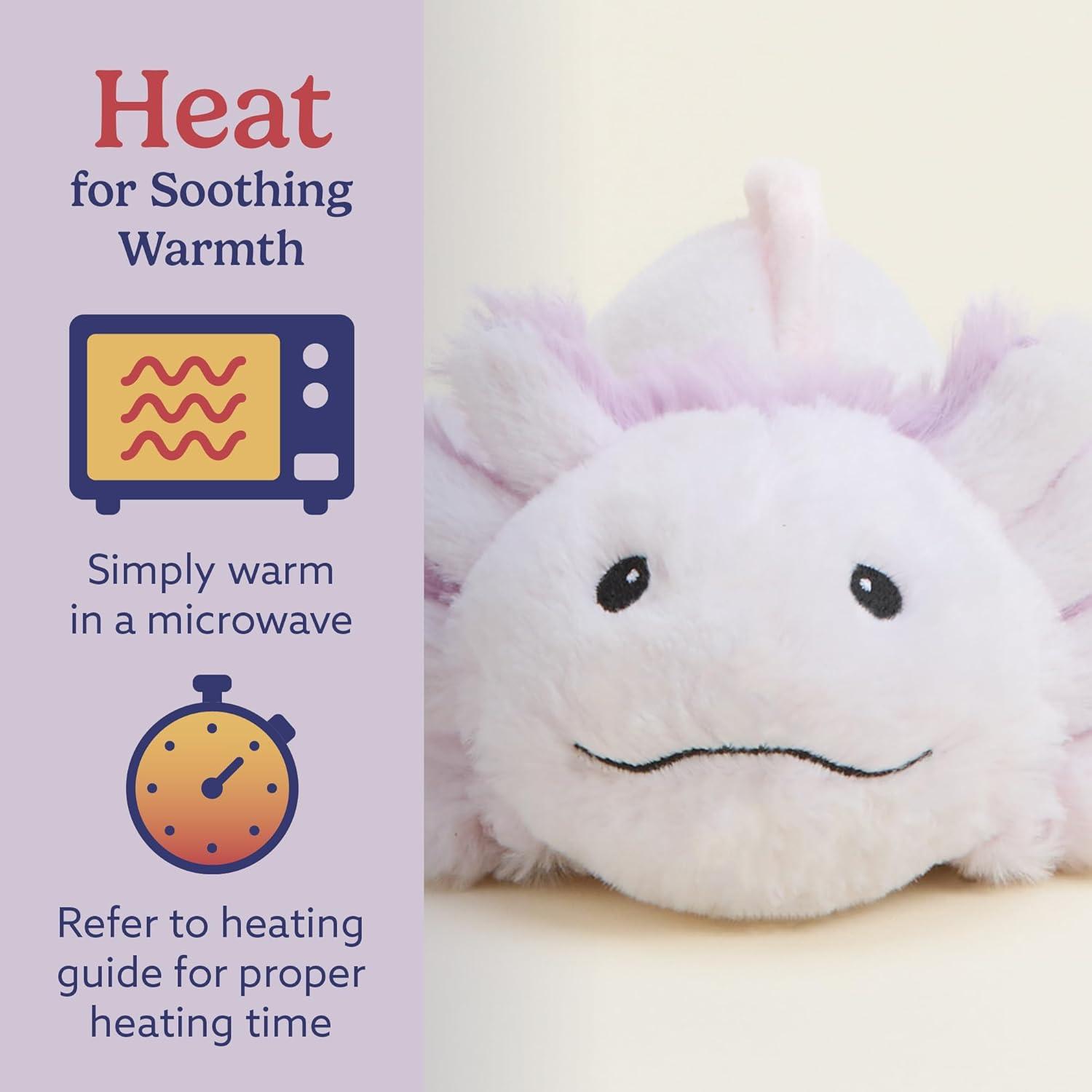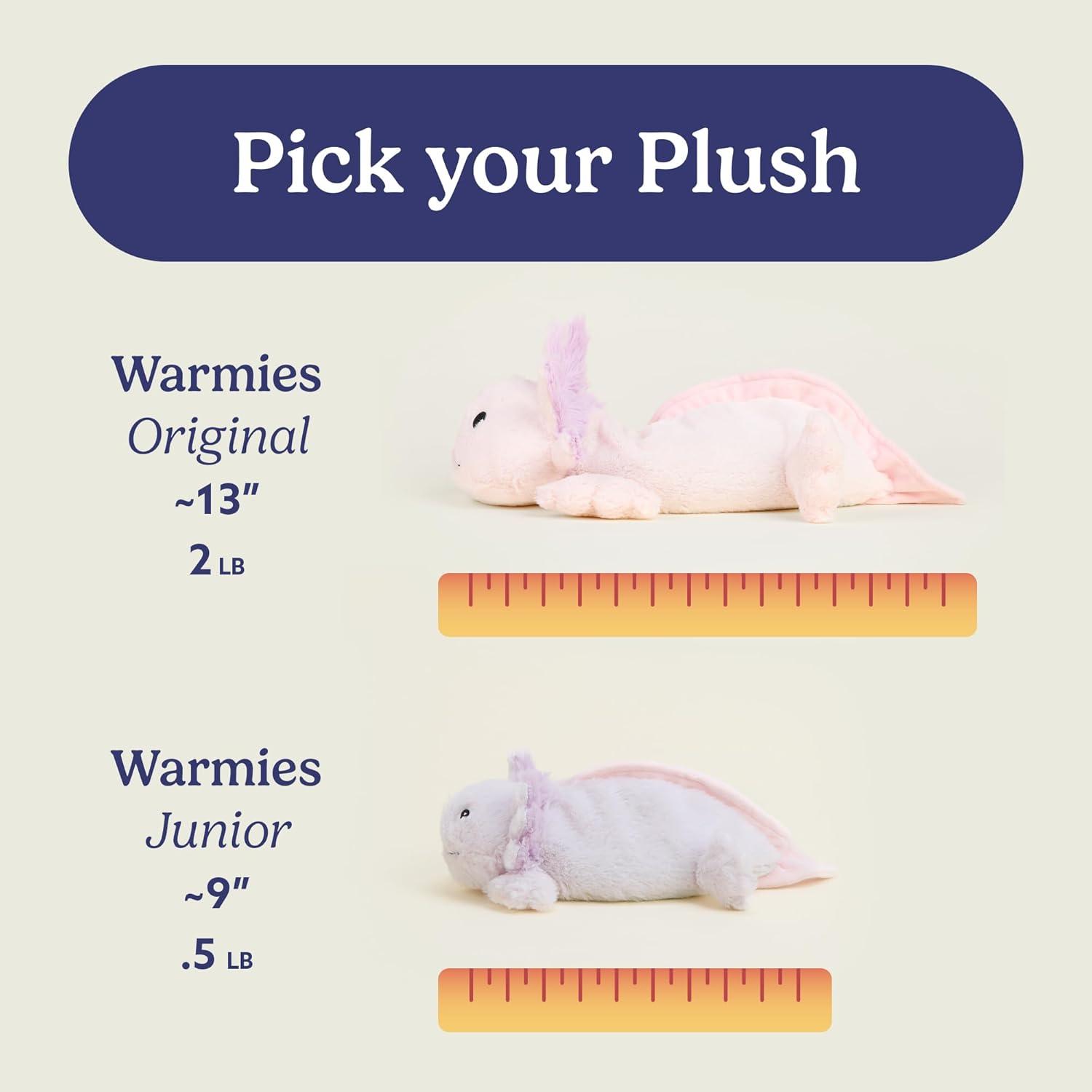 Warmies Junior Microwavable Stuffed Animal: Smaller in size, Pink Axolotl is a snuggable, huggable, lovable weighted plush toy for all ages that can be easily heated to provide hours of soothing warmth or chill in the freezer for a refreshing cool touch. Perfect for comfort and snuggles. 9 inches tall. 0.5 lbs.