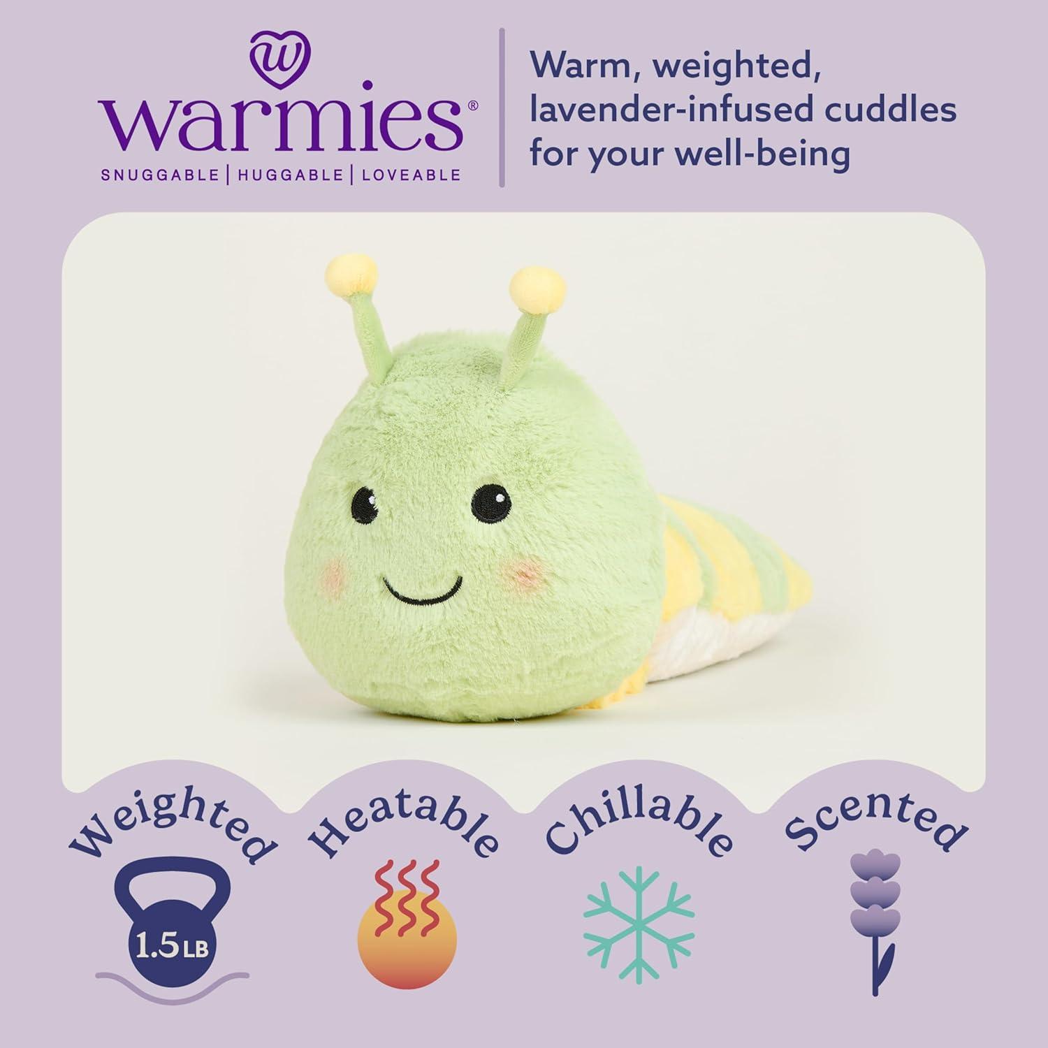 Warmies Microwavable Stuffed Animal: Caterpillar is a snuggable, huggable, lovable weighted plush toy for all ages that can be easily heated to provide hours of soothing warmth or chill in the freezer for a refreshing cool touch. Perfect for comfort and snuggles. 13 inches tall, 1.5 lbs.