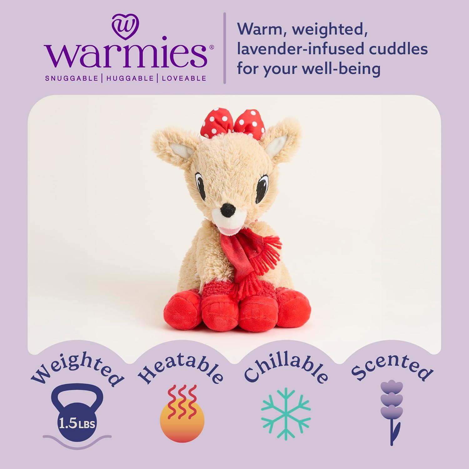 Warmies Microwavable Stuffed Animal: Clarice is a holiday-inspired, snuggable, huggable, lovable weighted plush toy for all ages that can be easily heated to provide hours of soothing warmth or chill in the freezer for a refreshing cool touch. Perfect for comfort and snuggles. 13 inches tall, 1.5 lbs.