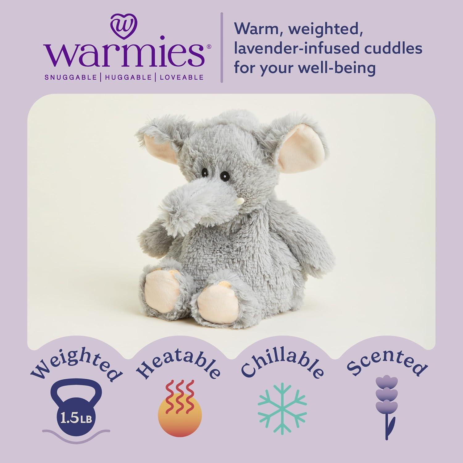 Warmies Microwavable Stuffed Animal: Gray Elephant is a snuggable, huggable, lovable weighted plush toy for all ages that can be easily heated to provide hours of soothing warmth or chill in the freezer for a refreshing cool touch. Perfect for comfort and snuggles. 13 inches tall, 1.5 lbs.