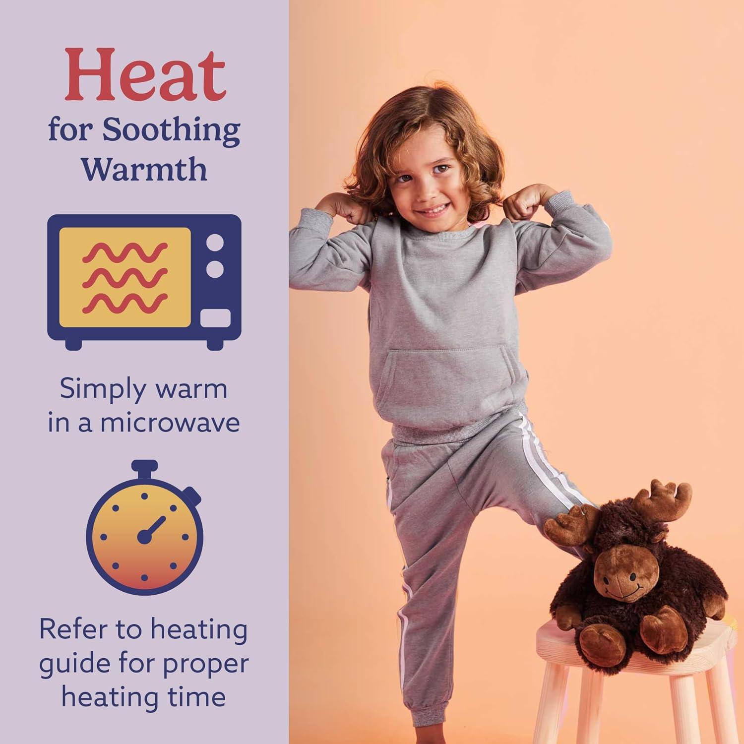 Warmies Microwavable Stuffed Animal: Moose is a snuggable, huggable, lovable weighted plush toy for all ages that can be easily heated for hours of soothing warmth and calming comfort or chilled to provide cooling relief. 13 inches tall. 1.5 lbs.