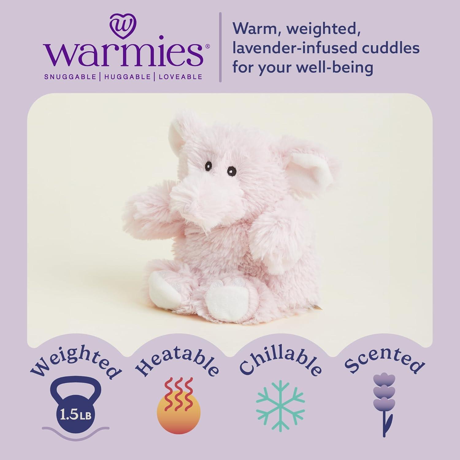 Warmies Microwavable Stuffed Animal: Pink Elephant is a snuggable, huggable, lovable weighted plush toy for all ages that can be easily heated to provide hours of soothing warmth or chill in the freezer for a refreshing cool touch. Perfect for comfort and snuggles. 13 inches tall, 1.5 lbs.