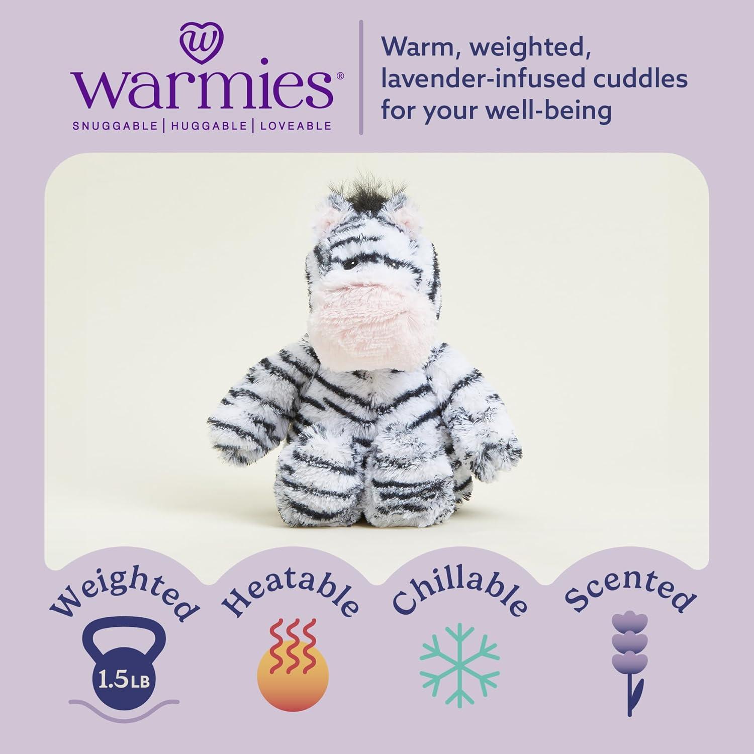 Warmies Microwavable Stuffed Animal: Zebra is a snuggable, huggable, lovable weighted plush toy for all ages that can be easily heated for hours of soothing warmth and calming comfort or chilled to provide cooling relief. 13 inches tall. 1.5 lbs.