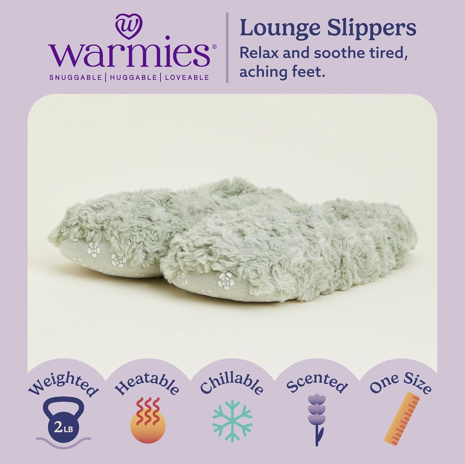 Warmies Microwavable Slippers: These cozy Gray slippers can be easily heated to provide up to an hour of soothing warmth and comfort for tired, aching feet. Scented stretchy indoor slippers are one-size-fits-most. 2 lbs.