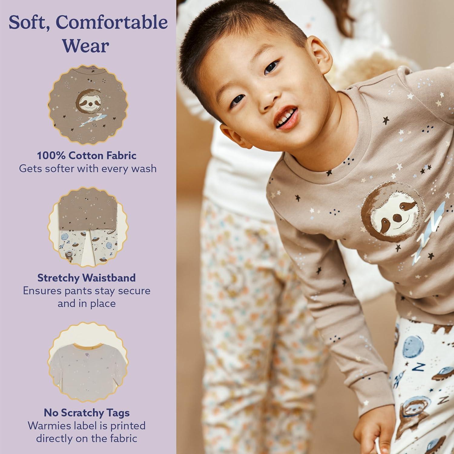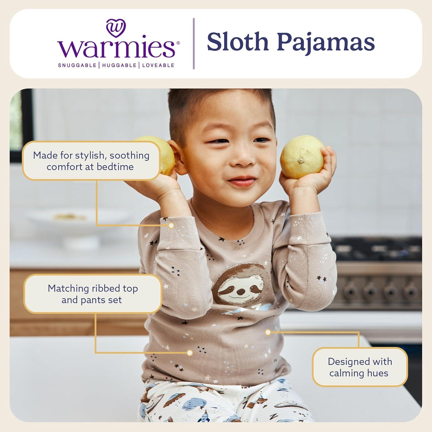 warmies Unisex Pajamas for Toddler Boys & Girls – 100% Cotton Fabric, Children Sleepwear – Sloth Animal Print Pattern Beige