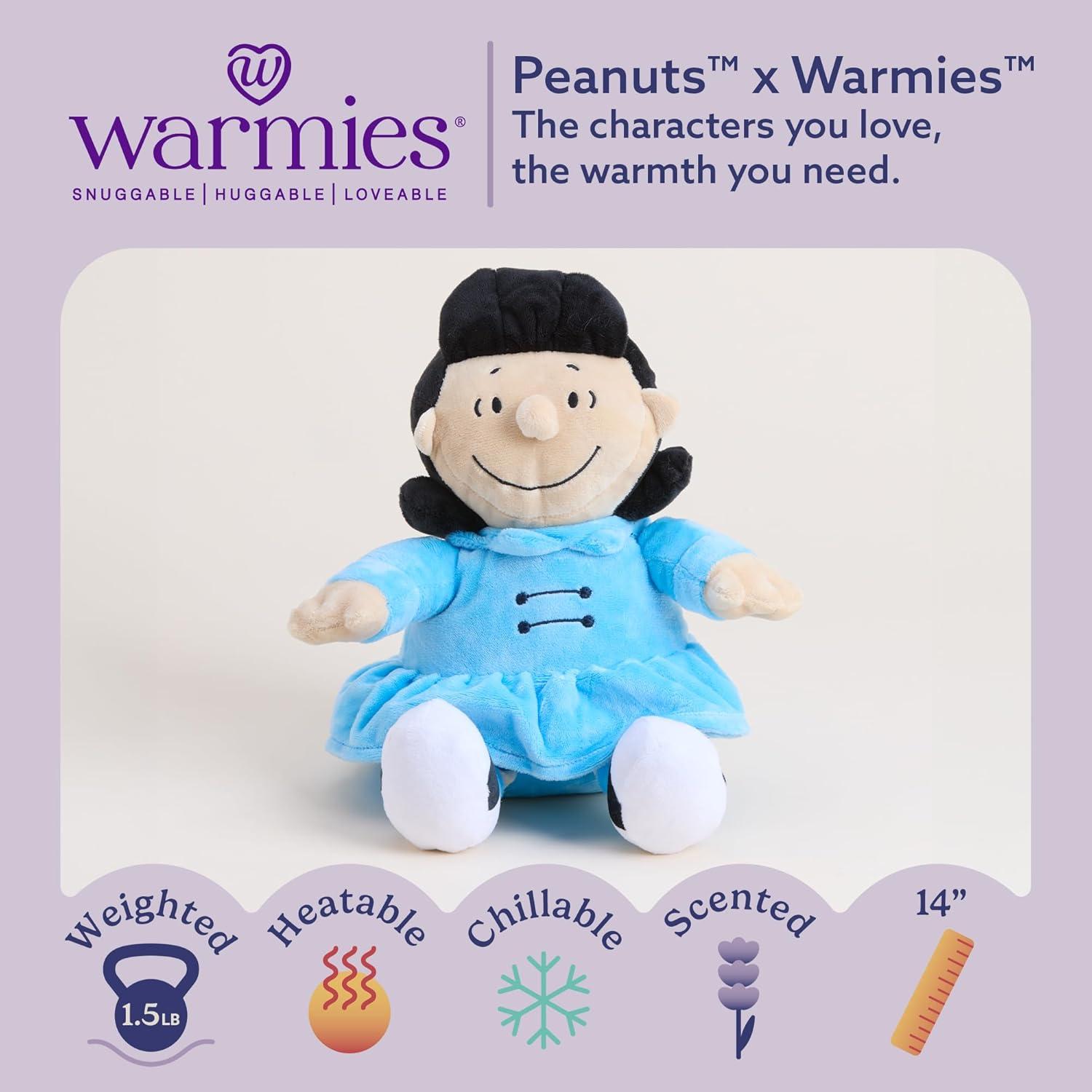 Warmies Microwavable Stuffed Animal: Featuring the beloved Peanuts icon, Lucy! This snuggable, huggable, lovable weighted plush toy for all ages that can be easily heated to provide hours of soothing warmth or chill in the freezer for a refreshing cool touch. Perfect for comfort and snuggles. 13 inches tall, 1.5 lbs.